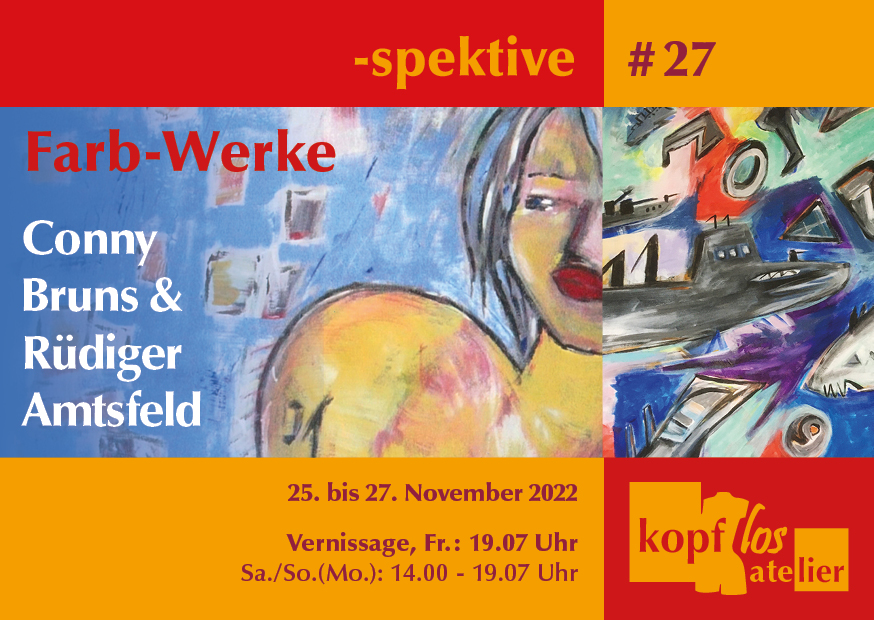 Der Verein kopflos atelier e.V. freut sich, im Rahmen seiner Ausstellungsreihe „-spektive“ Conny Bruns und Rüdiger Amtsfeld mit ihrer Ausstellung „Farb-Werke“ begrüßen zu dürfen. Vernissage ist am 25.11.2022 um 19.07 Uhr. Weitere Möglichkeiten: Sa. 26.11. & So....