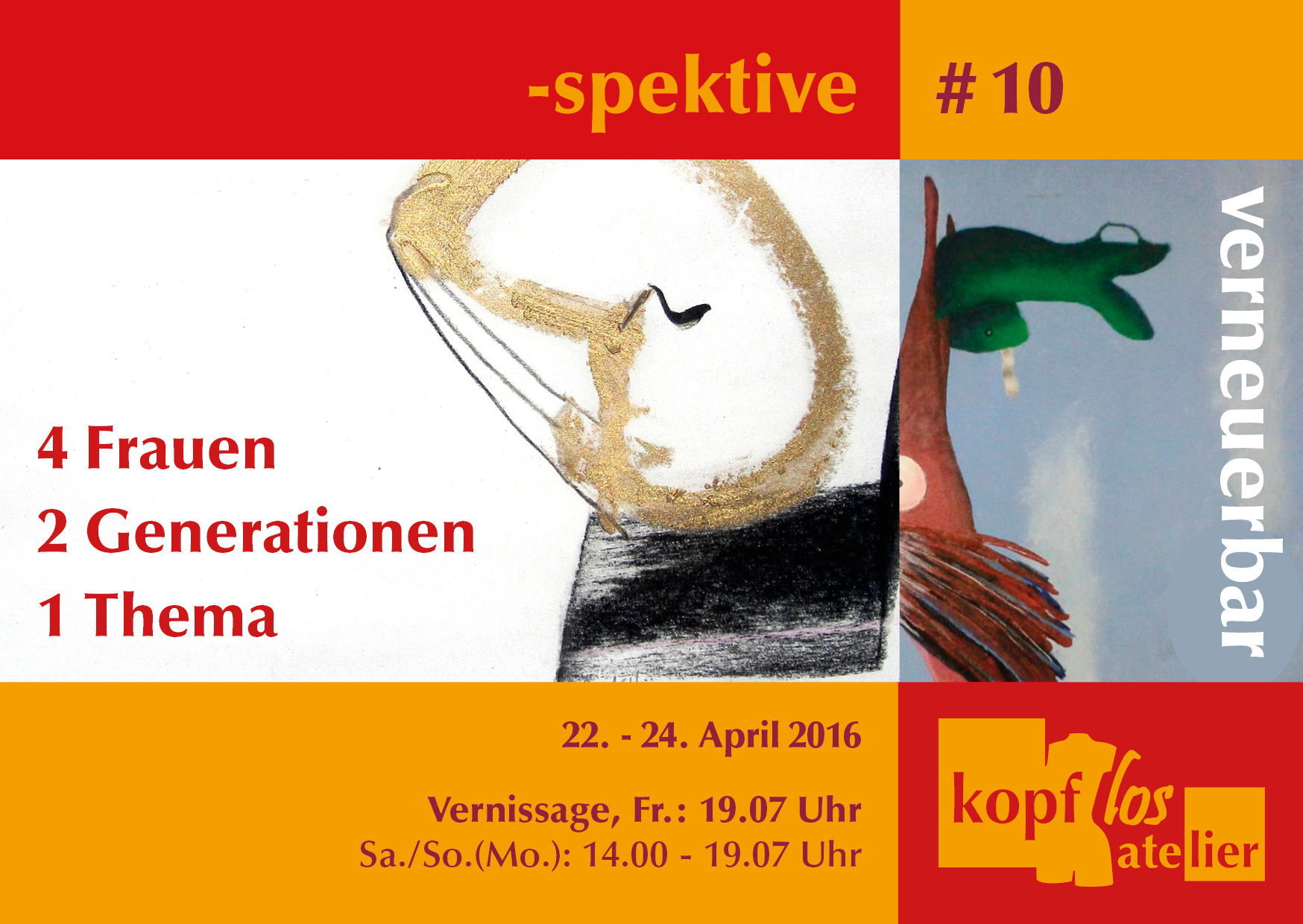 Unsere Ausstellungsreihe -spektive, welche seit 2014 alle drei Monate stattfindet. Die Januar-Ausstellungen sind jeweils von Kopflos zusammengestellt, jedes Jahr unter einem anderem Thema. Die anderen Termine werden von einzelnen Mitgliedern oder auch Gästen des Ateliers organisiert.